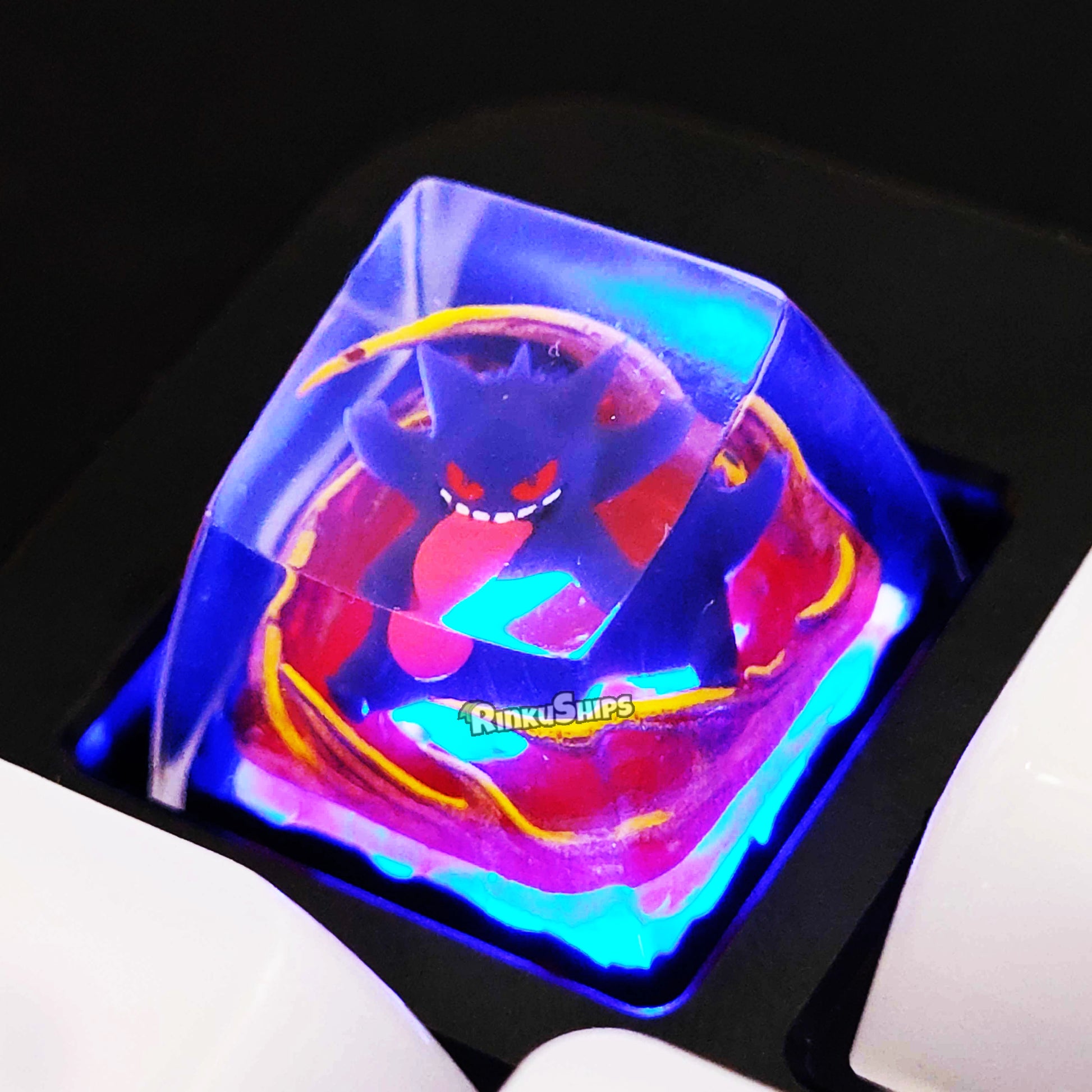 This Gengar resin artisan keycap is a handcrafted custom keycap designed for mechanical keyboards with MX-style stems including Cherry MX, Gateron, Kailh, and other compatible switches.